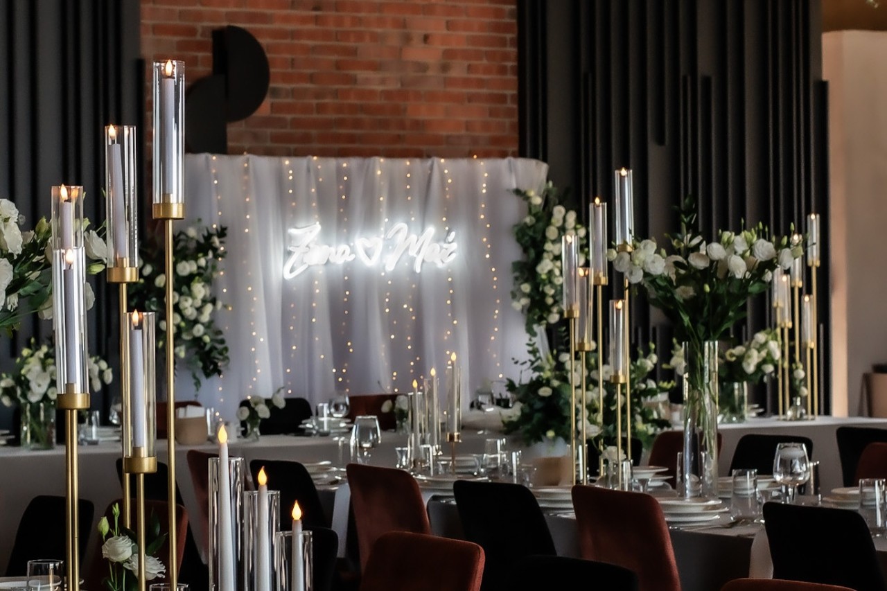 Złote świeczniki dodały aranżacji szlachetnego charakteru, odbijając światło i tworząc ciepłą, intymną atmosferę. To właśnie takie detale sprawiają, że przestrzeń nabiera wyjątkowego charakteru i zapada w pamięć gości.